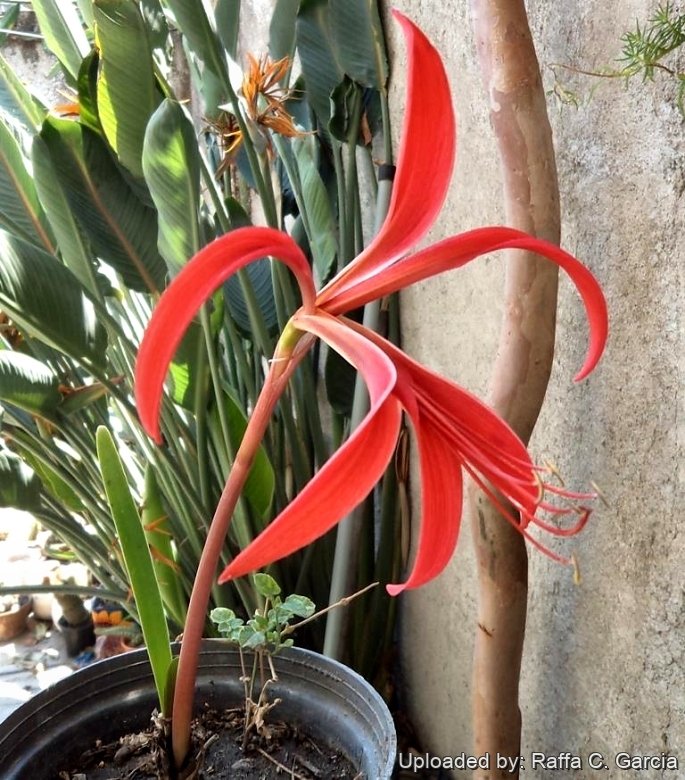 Flowers: Very showy, sweet-scented, consisting of a very short tube, and a limb of six segments, of a bright crimson, green at the base. Segments of the perianth crimson, the upper segment is broadest, straight a little way, then ascending, and after being expanded two or three days it becomes reflexed. The two side ones stand inside the upper one, and are considerably narrower than the other four, spreading, and bending round like a bow, attenuated a little towards the base. The three lower segments hang down, their points being curved inwards towards the scape; the middle one is rather shortest and broadest and is enclosed above half way by the outer ones. Stamens six. Filament inserted equally with a connecting membrane at the base of the perianth, fasciculate, declined and recurved as the style, about 10 cm in length, tapering to a slender point, which is inserted into the anther considerably above the base. Anthers pedulous, affixed one third from the top, linear before bursting, nearly 2,5 cm in length, crimson purple, with straw coloured pollen. Ovary obtusely three angled, three celled, three valved. The style is bright red, longer than the filaments, ascending at the apex,terminated by a three cleft stigma. Stigma three-parted with obtuse reflexed papillose lobes