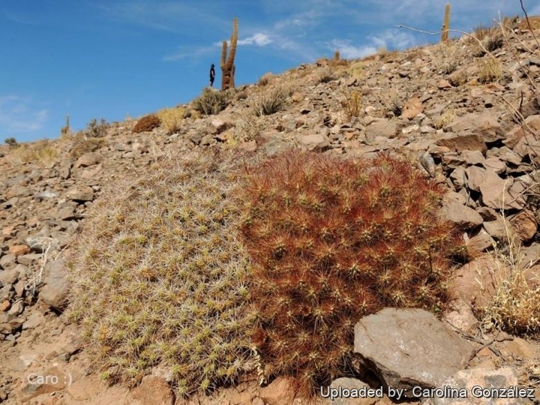 The red spined Cumulopuntia boliviana subsp. ignescens (right) grows in close association with Maihueniopsis conoidea, a local form of Maihueniopsis glomerata.