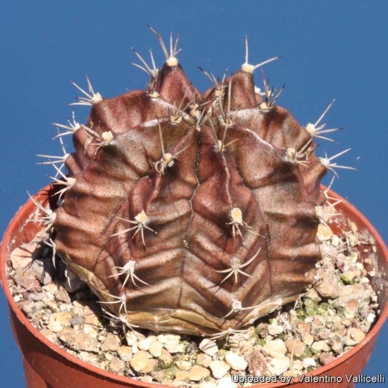 Gymnocalycium friedrichii var. moserianum Pazout ex Moser: has brown bodies 2 times larger than G. friedrichii, with sharp ribs striped with white, and only 3 weak spines. Flowers are pale pink and open up entirely. Distribution: Yrebdaque, Boquerón, Paraguay.