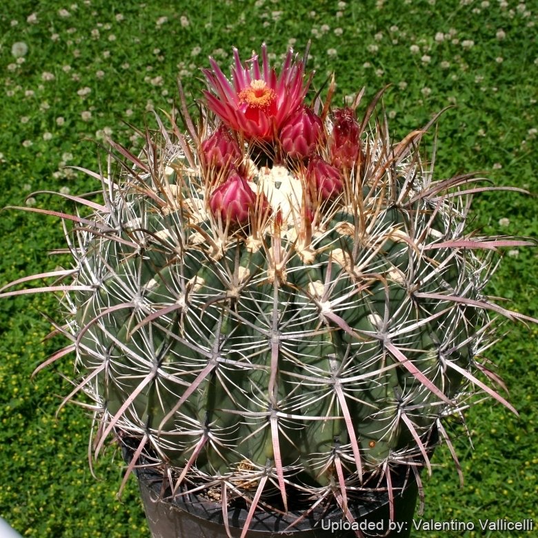 Central spines: 7-13 in two series, reddish-browm or greyish-pink with paler tips, banded, the main 4 forming a cross, upper and lower flattened, lateral two subulate, lower longest, 2,5-4 cm(rarely up to 6 cm)long, 6-10 mm wide, rather convolute and curved but not hooked at tip.