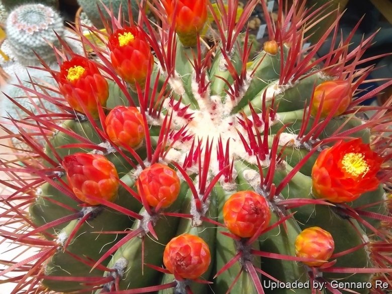 This is one of the controversial geographical forms of the variable Ferocactus pilosus with thick red spines and usually without or with very few white bristles.
