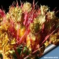 Flowers: Yellow flowers tinged with red appear in May and June at the crown of the plant, 4 to 6cm. The fruit with scales is fleshy, yellow or yellowish green 5 cm long, 2,5 cm in diameter.