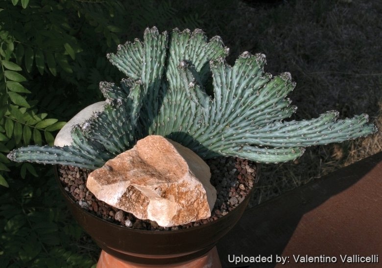 This easy to grow plant is very attractive because of its spectacular blue-green marbled stems with pronounced sculpture effects. There is also a similar crested monstrous form with white purplish mottled stems.
