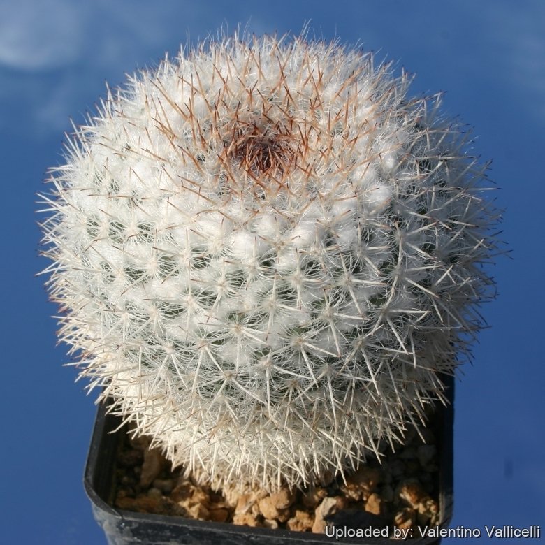 Its symmetrical globose body is largely obscured by the fairly numerous interlacing white radial spines and wool, against which the reddish centrals stand out. After several years the old plants divide at their apex, ramifying dichotomously.