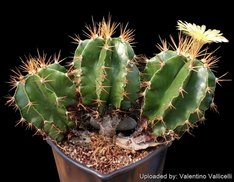 Stem: The stem is solitary, globose when young, cylindric with age, up to 1,2 m or more high, 15-30 cm across, dark green without (or with very few) wooly flakes.