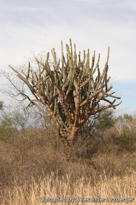 Stem: Branches cylindrical, succulent, 5 to 10 cm thick (to 13 cm at the base), glaucous blue when young becoming grey-green or light olive-green later.