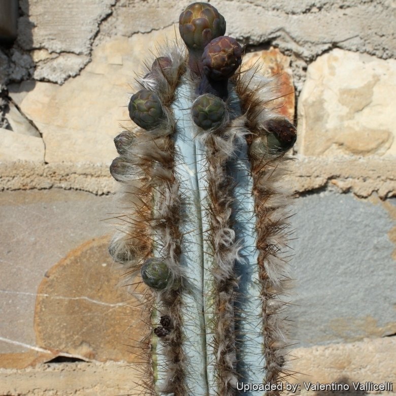 Pseudo-cephalium: The area where the flowers will grow is called a pseudo-cephalium, it is usually well defined, apical to lateral, involving three or four ribs. Flower-bearing areoles have much denser silky white hairs 4-10 cm long.