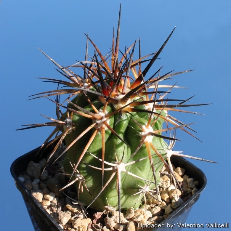 Habit: It is a strongly spined cactus that branches vigorously from the base, forming large clumps or cushions. In habitat, the bodies are much compact and very spiny. When grown in pots, this species tends to elongate and have darker spines on most of the body, with grey-white spines only appearing on the oldest areoles at the bottom of the plant.