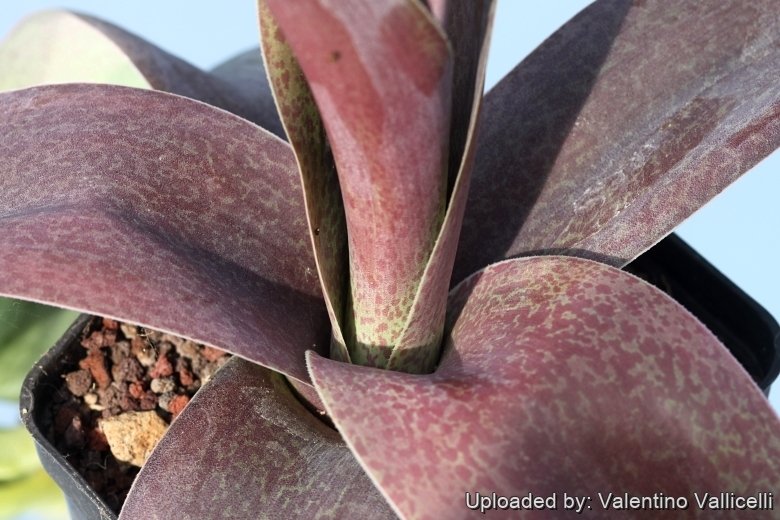 Leaves: Succulent, thick, rubbery (softer than an agave with bristles that are not sharp), 30-45 cm long by 7-10 cm wide, glaucous-grey-green washed in lavender in sun, densely covered with small iron-purple to coffee-colored spots that are crowded toward the tip of the leaves where the entire surface is a brown-purple colour. The contrast of colours is most prominent when plants are grown outside exposed to the sun and intensifies in cold weather or drought stress .