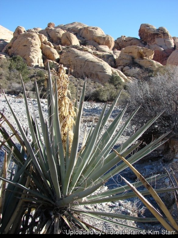 Habit at Childrens Discovery Loop trail Red Rocks, Nevada. December 26, 2007. Photo by: Forest Starr & Kim StarrCultivation and Propagation: Yucca baccataSN|29966]]SN|29966]] is a carefree trunkless and durable plant that become the centre of attention. when it blooms. It give the landscape a distinctive desert flavour. Its knee-high height suits it to midgarden placement and side-yard or corner plantings. The bladelike leaves add vertical structure to a cactus or xeriscape garden. This small yucca has become one of the most sought after of the woody lilies. This species is highly tolerant of drought, frost and heat. Like their larger counterparts, these yuccas have needle-tipped leaves, so don't plant them near play or walk areas.