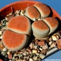 Propagation: Seed or (or rarely) cuttings. The small seeds can be sown in pots of fine, well-drained sand, any time during the spring and summer months when temperatures are warm. Cover the seeds with a very fine layer of grit and water from below with a fungicide to prevent damping off. For the first 3-4 days cover the pots with a sheet of glass/clear perspex to keep the humidity levels high. Remove the glass and replace it with light shadecloth and mist once or twice a day for the next two weeks after which most seeds should have germinated. From then on mistings can be reduced to every second and then every third day as the little plants grow. Take the cuttings from a grown-up mother plant. Each cutting must contain one or more heads along with a fraction of root and permit them to dry out a couple of days, lay the cuttings on the soil and insert the stem end partially into the soil. Try to keep the cutting somewhat upright so that the roots are able to grow downward. It is relatively difficult to root Lithops from cuttings and generally pointless as well, so quick are they from seed.