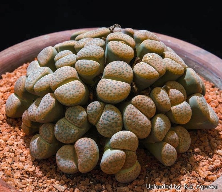 - Lithops fulviceps var. lactinea D.T.Cole: (Syn: Lithops. geoffreyi, Lithops verruculosa) Cole number: C222. It is endemic to a very small area where it is found growing on a gentle limestone slope. This plant except for the face colour is the same as the type. Face is opaque, milky bluish or greenish or pinkish grey-white or grey with dusky dots mainly bluish green. Shoulders milky grey-white, or bluish grey-white. Rubrications yellowish or reddish orange, sometimes barely visible. It is a medium medium to large plant up to 40 X 30 mm wide. Usually few branched with up to 4 heads (or more in cultivation).