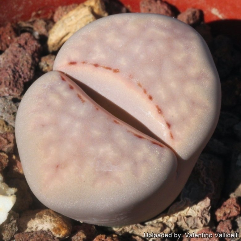 Description: Lithops juliiSN|13037]]SN|13037]] is a very pretty Lithops with characteristic “lip-smears” which is a distinctive feature of this species. The lip-smear occurs occasionally as a narrow edging or lining all along the outer margins. Three main forms have been proposed and were even given varietal status (“pallid”, “reticulated” and “fuscous”) but wild populations tend to have at least two and many have all three of this forms variously intermingled.