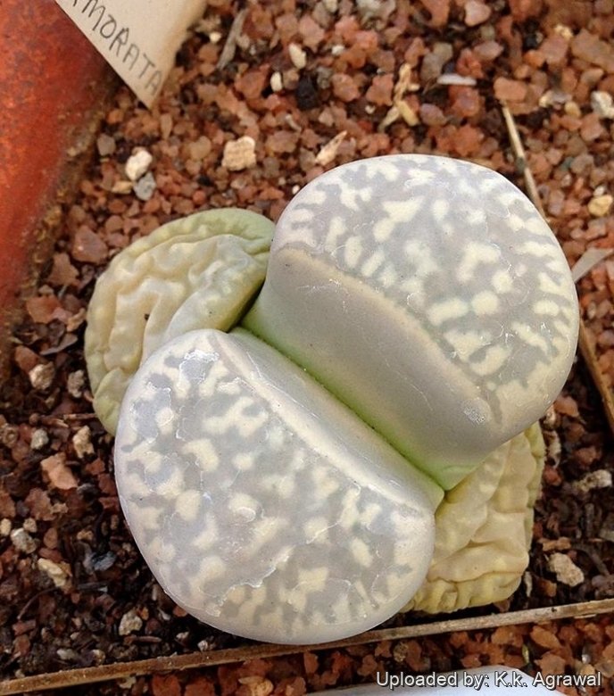 Lithops marmorata (N.E.Br.) N.E.Br.: It is solitary or forming clumps of 2 or more heads. It is normally a grey bodied plant with sides coloured light grey-green-yellow, the top of lobes is slightly convex, smooth with fairly open grey-green coloured window, usually marbled in appearance and sometimes with a purplish flush. The flowers are white.
