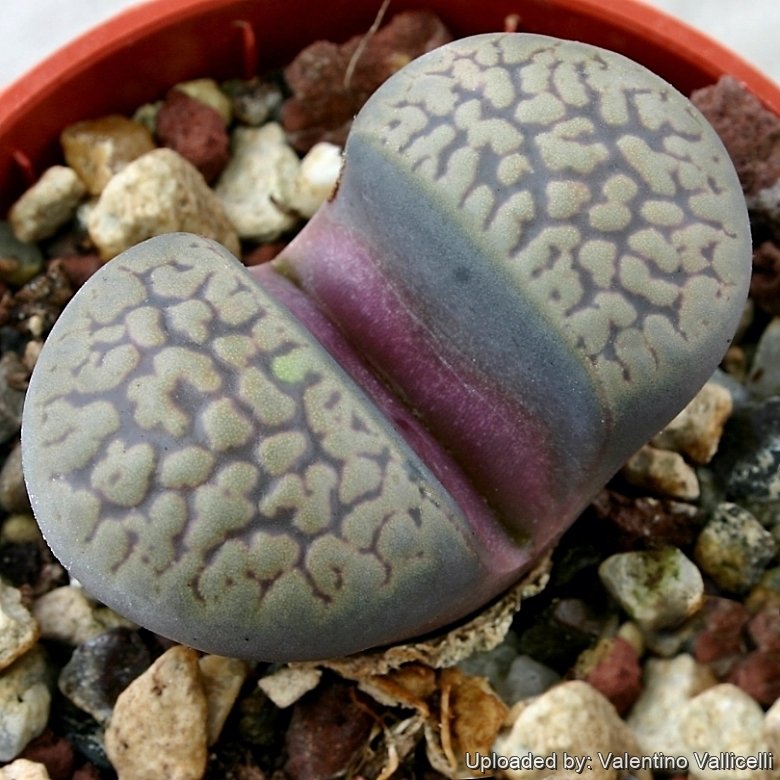Bodies (paired leaves): Turbinate, truncate-cordate in profile, 20-35 mm 15-23 mm height. Lobes, of unequal size or convex, elliptic-reniform from stand-up viewing and, especially in the young stage, obliquely convex, smooth to slightly rugose. Fissure fairly deep. Window large, partially occluded, various shades of opaque or very obscurely transluscent greyish or bluish green or pinkish blue, or window broken up into a large number of confluent windows by small irregular-shaped islands sometimes giving the window a fine rugulose appearance; these islands fairly regular, sometimes slightly raised opaque pinkish beige, light grey or pale greenish-grey the islands sometimes more deeply coloured than the margins. Channels irregular broad to narrow, obscurely translucent slate grey, dark greenish grey or violet grey. Rubrication absent. Outer margin, greyish-green, distinct with numerous irregularly-shaped laciniae or teeth.Inner margin minutely lobed.