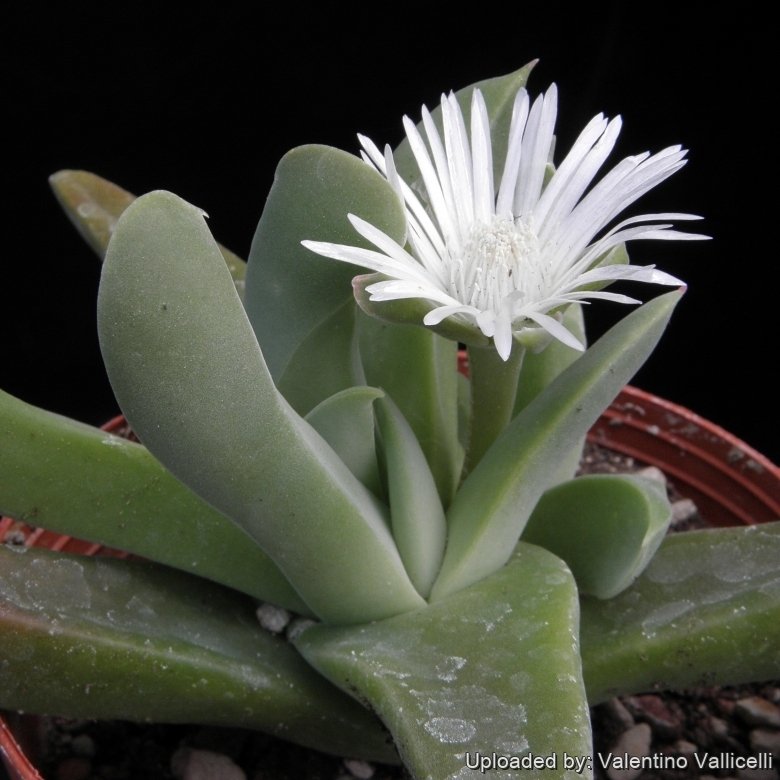 Description: Gibbaeum schwantesiiSN|14356]]SN|14356]] is a white flowering form of the very variable Gibbaeum velutinumSN|14358]]SN|14358]]. It is distingushed for its slender narrowly triangular, laterally compressed leaves, that are longer more strongly incurved than the shorter, about 6 to 10 cm long and less silvery/grey. It has unequal leaf pairs, with the longer leaf being twice the length as the shorter. The longer leaf of each pair, with almost axe-like, hooked upper end. The flowers are larger (up to 50 mm in diameter) mostly white, but occasionally with a pale pink flush and the flower stalks 3-5 cm long. Like the type species it is very variable. Gibbaeum schwantesiiSN|14356]]SN|14356]] often has a reddish tinge.