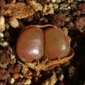 Bodies (paired leaves): Cylindrical, 2-3 cm long,1.4-1,6 cm wide, 1-1,2 cm thickwith the fissure between the leaves extending completely across body. Lobes distinctly but roundly keeled, smooth, glabrous, soft to the touch, reddish-brown (usually), purple or almost pure aquamarine-green, coppery in the resting season, with a very translucent and shining large window clear as water crossing the whole leaf top that, at the base, merges into several lighter dots.