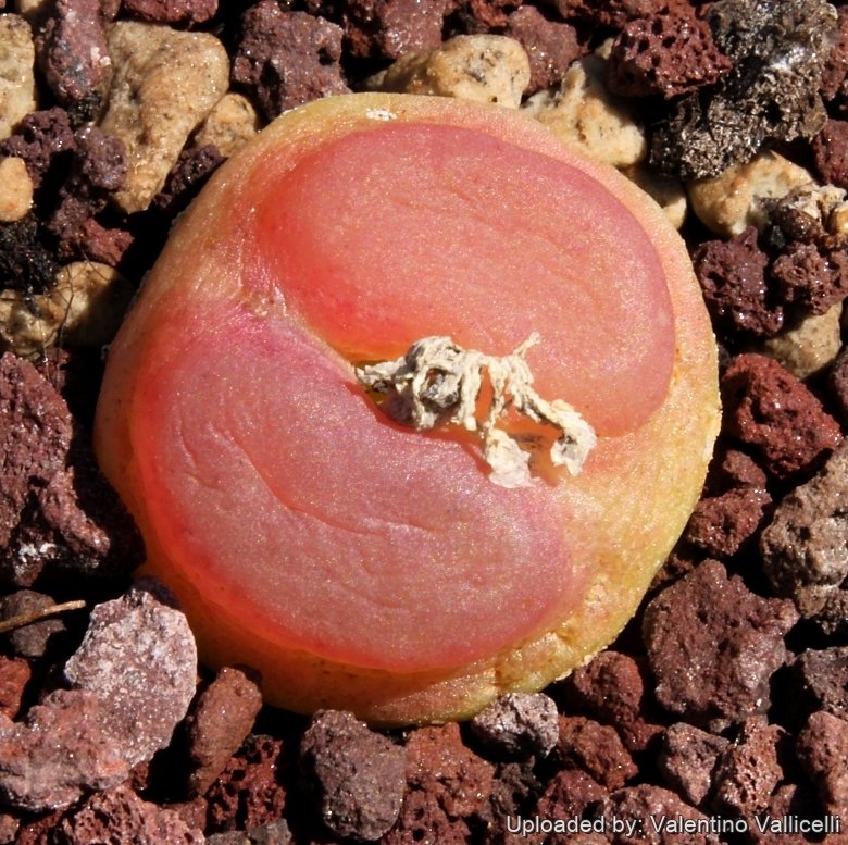 Body (paired leaves): Broader than tall, soft, jelly-like and windowed, green to yellowish-green in winter during the active growing phase, but gradually turning orange to purple-red in the pre-dormancy phase in early spring, then the skin begins to thin and loses colour, until finally, when the hot, dry days of summer arrive the plants go dormant and they seemingly retreat into a dry, papery cocoon spun from their own skins. In Africa, these shield allow them to endure harsh summer conditions until the autumn growing season when they bloom again.