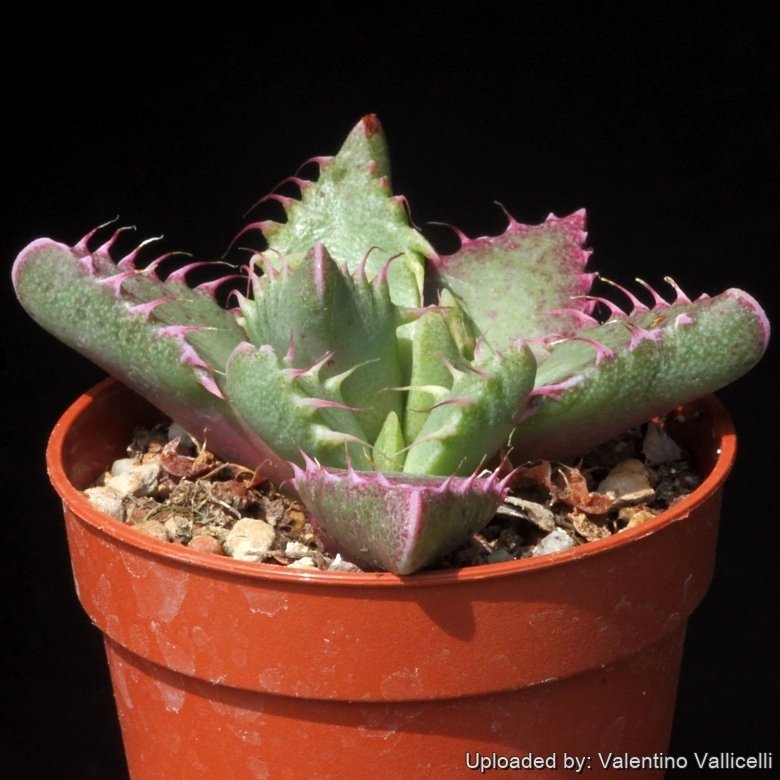 Leaves: Up to 70 mm long, 5-20 mm broad, slender, spreading, rhomboidal, somewhat elongated, tapering gradually, keeled. Margins with 5-8 teeth in the upper half (rarely more or less); teeth broad, fleshy, curved, white or pink ending in papillate awns of 0,5 to 3 mm length. Faces of leaves dark green to grey-green smooth or with indistinct whitish-grey dots, wax cover thin, crystals in the outer walls in certain areas resulting in white dots.