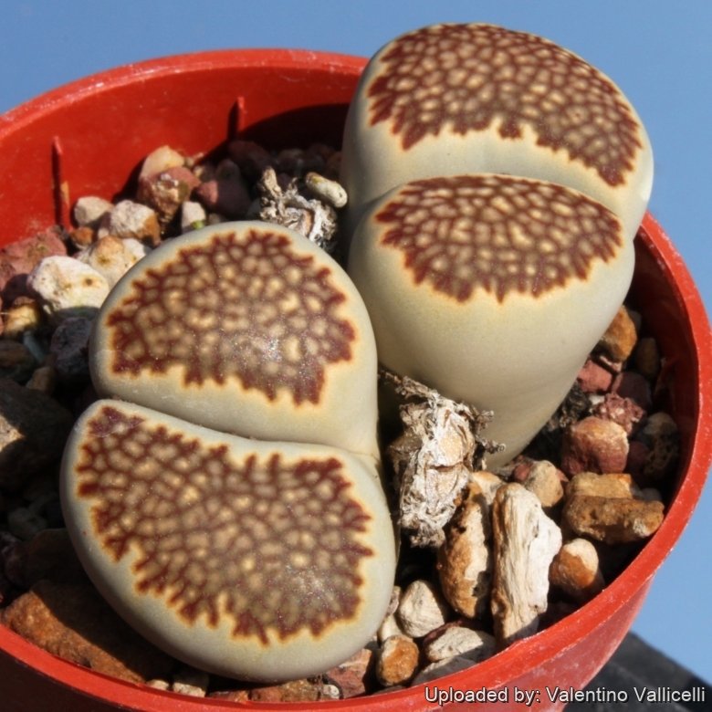 Body (paired leaves): Cone-shaped, truncate, separated by a 5-10 mm deep fissure with (usually) conjunct lobes. Face slightly reniform flat or slightly convex; sides coloured pate to very pate (bordering on slightly yellowish-white); in the young stage rugulose, the islands irregular in shape, coloured same as sides; the depressions of a dark yellowish-brown colouration forming a fairly broad network, in the depressions isolated dark red dots and very short prominent, broad dark-red tines, sometimes all the tines interconnected with one another, thereby giving the whole depression a deeper tint; in the older stage the islands are fewer, due to the depressions flowing into one another and forming a fairly large window of a much tighter colour, with here and there the remains of a dot or tine; these entirely absent afterwards, giving the whole a much tighter colour and the appearance of a different plant; the islands verging on white and the depressions a pate grey-green colour; in the later stage the outer margin with teeth of irregular shape and size; inner margins straight; in the very old leaves blue-green dots. This species is very variable some specimens being opaque whitish-grey and almost uniform in colour, others opaque but strongly reticulated with fine impressed brown markings, yet others with largely open obscurely translucent windows.