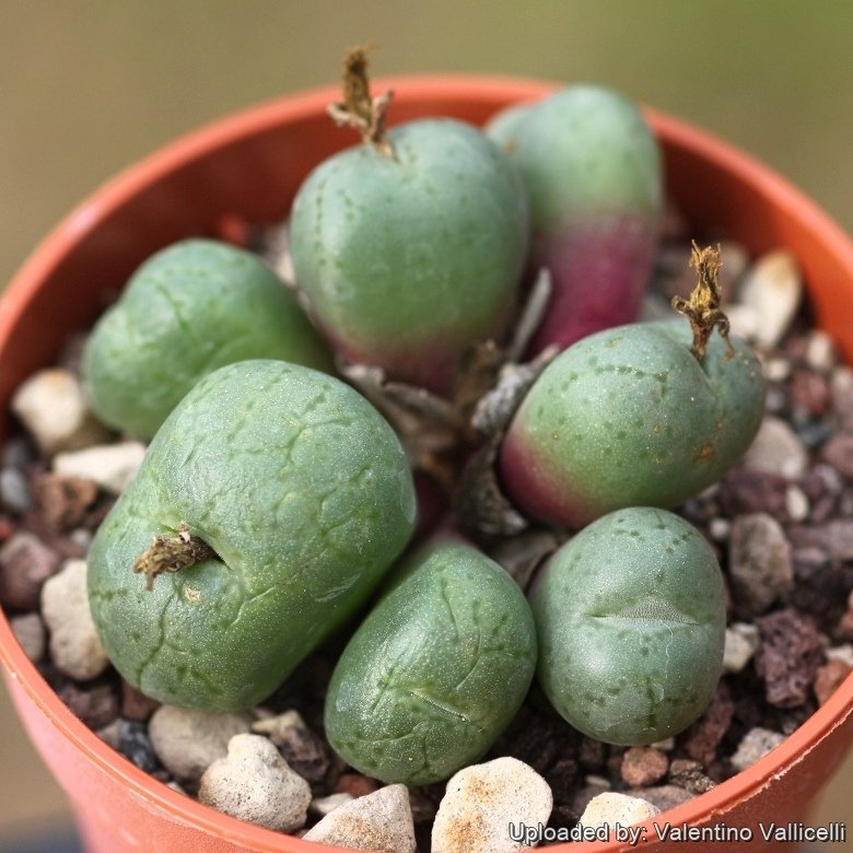 - Conophytum uviforme subs. rauhii (Tischer) S.A.Hammer: Leaves small metallic and striate. Distribution: Namaqualand.