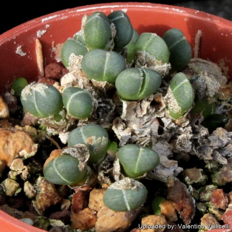 Bodies (Paired leaves): Semi-globose, silvery green, waxed, about 4 mm long, and 4 mm in diameter with age. It has leaves of two form on the same plant or stem (heterophyllous) one leaf-pair with a smooth surface forming a white body in the resting state, the keel markedly smooth, the margins ciliate, this leaf-pair completely embracing the subsequent one with longer free parts with short papillae on them. More than one free leaf-pair can be formed per season.