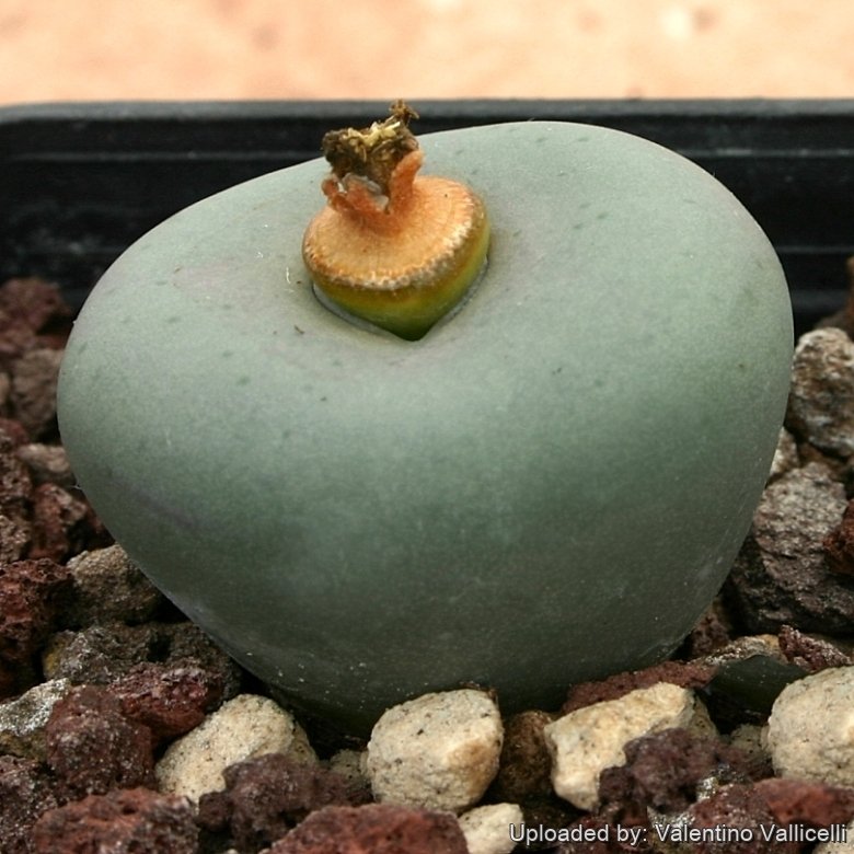 Bodies (paired leaves): Nearly perfectly spherical to somewhat laterally flattened, about 16-20 mm high and rather more across (up to 24 mm Ø), with only a tiny a cleft about 4 mm across, chalky greyish green, pale blue-green or purple blue in colour, without dark dots or stripes (rarely with very scanty spots) and sometimes ribbed. During the summer season, plants aestivate and the body is gradually replaced by a new young pair of leaves.