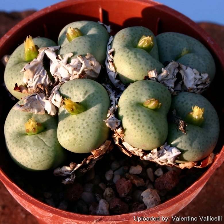 Notes: Plants of the genus Conophytum are also known as 'living pebbles'. During the rest period (the summer months in Europe) a new body forms inside the old, gradually taking all the substances from it until all that remains is the skin, which dries and protects the young plant from the heat of the sun and excess evaporation of water. The resting Conophytum protected by this dry cover resembles a pebble and hence the name 'living pebble'. The growth period of most species is from August to March. The temperature should be about 10 to 12°C