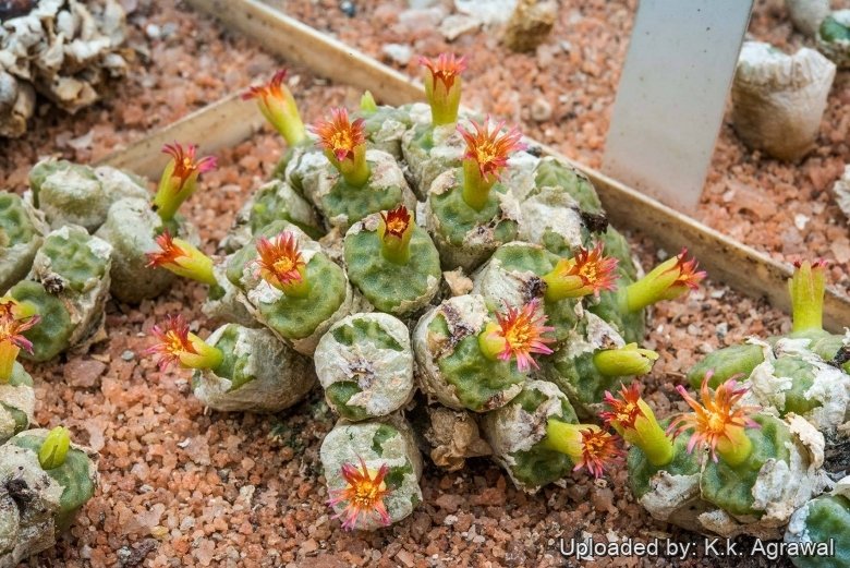 The flower is almost the head of a matchstick. This is a late flowering variety - almost after sunset. Photo by: K.k. AgrawalCultivation and Propagation: They are relatively dificult to grow. These plants grow on winter rain and head for summer dormancy. The growing season in northern hemisphere is from September to March. They require little water; otherwise its epidermis breaks (resulting in unsightly scars). Water minimally in summer, (only occasional misting). Water regularly in winter after the previous year's leaves have dried up. Require good drainage. They enjoy full sun or half-shade and in summer they need to be kept in a cool area. Hardy to -2°C. Ensure a very good ventilation. Avoid to repot frequently. They may stay in the same pot for many years. Plants grown in larger containers have frequently relatively poor flowers. They might improve when the plants are given their own, small individual pots.