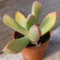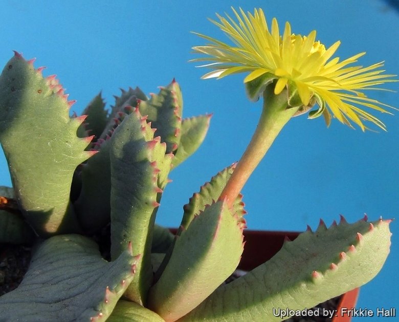 Leaves: Simple, paired and united at the base in a flat rosette, succulent, yellowish-green to blue-silver-green, trigonous, broadening at the apex with the keel chinned near the apex, margins with no or (more often) few teeth, unlike the smooth margins in the rest of the group, to 45 (or more) mm long, basally to 10 mm in diameter, near the apex 15-16 mm across.