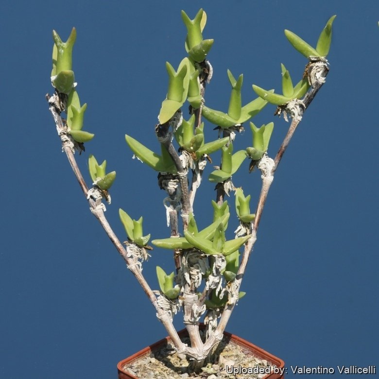 Habit: It grows in quartz protected by a tangle of rocks and other succulent shrubs. These included meter-high specimens of Othonna arbusculaSN|34333]]SN|34333]]. In its local habitat, from May to August, when plants grow, the weather is cold, and temperatures sometimes dip below 0ºC.