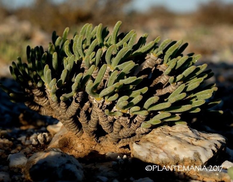 Leaves: The leaves are opposite as in most members of the family Aizoaceae, but are somewhat peculiar in that the plant produce two different pairs of leaves. This is called heterophylly. The first pair of the season emerges from the top "bead" in the form of a nearly hemispherical bag or sheath to 10 mm in diameter. The laeaves of the “bags” have a small tip, and are completely fused to each other, and are hidden during the resting state inside the latest sclerotic sheath. After two or three weeks in this stage, a second pair of leaves, totally different to the round ones, appear, these are more conventional, being long and cylindrical, about 10-15 cm long, and 3-5 mm in diameter, very soft, and short lived. They are united only at the base, with the basal part developing into a sclerotic jug-like persistent sheath at the end of the season. The long pairs of leaves are covered in glistening papillae (small crystalline cells), similar to the appearance of the stems of Mesembryanthemum crystallinumSN|32528]]SN|32528]]. During the growing season the plant bears both types of leaves for some time. M. moniliformis is distinguished from other species by the round, soft, short-collared sheaths which completely cover the leaves for the next growth period.