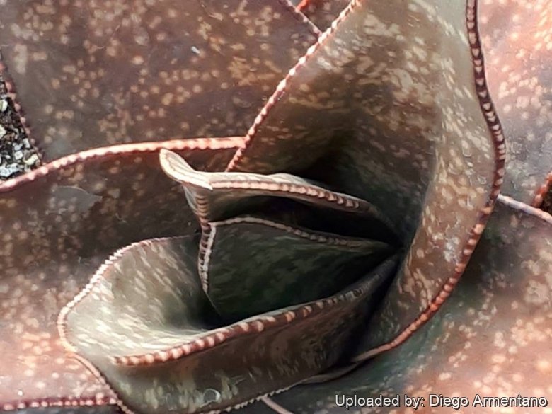 Leaves: Numerous (c. 10–30), thick, robust, arranged in a dense multifarious rosette, outer spreading, inner erecto-patent, triangular to elongated-triangular, (10-)20-30(-40) cm long, (6-)7,5-10(-18) cm broad and 12-18 mm thick, outer spreading to somewhat recurved, stiff, sharp, low down, face concave, back obliquely keeled, dull green, with a smooth surface (though juvenile plants' leaves are rough), with a few faint immersed spots of greenish-white arranged in transverse bands, which (rarely) may be barely visible, rarely striate. Margins, often very sharp, white-translucent, cartilaginous, interrupted with green, smooth, very obscurely papillose or heavily-serrated. Juvenile leaves distichous, densely white-spotted, patent, tongue-shaped and tuberculate.