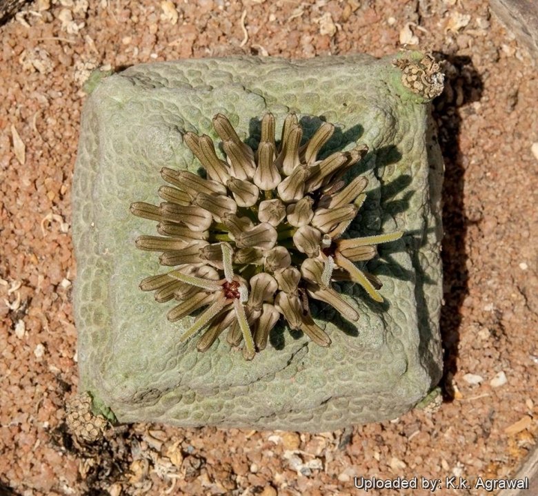 Stem: Usually single stemmed. Up to 12 cm wide and tall, basically cube shaped or with an evident four-sided figure form, tuberculate, leathery skinned, The colour vary from light green (in shaded environments) to clear olive/grey/green (in half sun) or reddish-brown (in full sun). Old plants with peduncles along some of the edges.