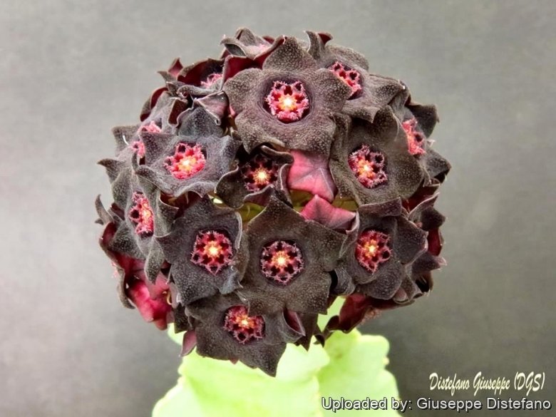 Flowers: Star-shaped, velvety purple-black. Sepals 2 mm long outside sometimes tomentose. Corolla black-purple, flat or funnel-shaped, approx. 2 cm in diameter. Corolla-lobes 8 x 8 mm broadly ovate-triangular, acute. in-side densely tuberculate. mostly papillate-pubescent, hairs long, purple, rims of the corolla-lobes mostly ciliate, hairs purple, vibratile, somewat clavate. Corona brownish-purple, 5 mm in diameter, weakly pubescent; iner coronal lobes deeply bifid, appendages falcately curved inwards, basal-medium region broadened, sometimes with a small appendage, more or less ciliate. Corona lobes blunt. not surpassing the Anthers, rarely glabrous. Pollinia inversely pearshaped. Flowers emit foetid scents, resembling rotten meat or decaying organic matter.