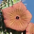 Hoodia gordonii (Masson) Sweet ex Decne.: has spiny stems similar to a cactus. Flower saucer-shaped to 75 mm across, pale straw, pale purple to dark maroon with darker venation. Distribution: Kalahari desert in South Africa, Namibia, Botswana and Angola.