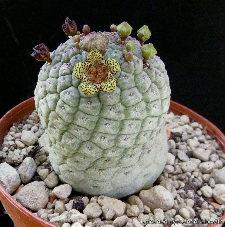 Similar species: At a first glance Larryleachia pictaSN|18681]]SN|18681]], if not in flower, may be confused with the closely related Larryleachia cactiformisSN|18681]]SN|18662]], generating more confusion among succulents fanciers and grower about it than about any other Larryleachia. It distingushes from the latter for the larger (up to 16 mm in diameter) creamy-yellow flowers marked with orbicular dots (not stripped) and noticeably reflexed petals.