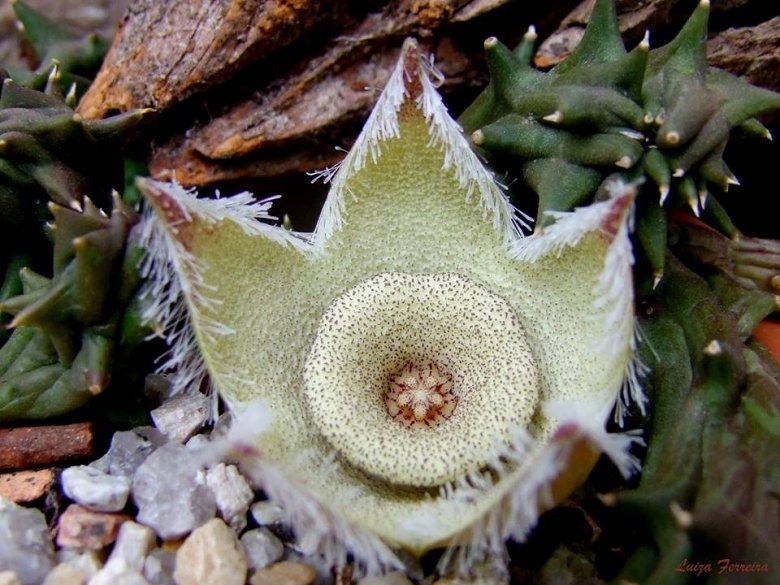Orbea ciliata (Thunb.) L.C.Leach: has creamy-white flowers with a raised annulusand strongly vibratile hairs which form a fringe along the edge of the corolla lobes. These hairs hardly remain still and move in the slightest breeze.