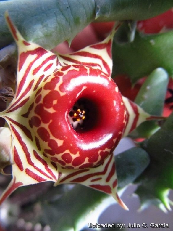 Huernia plowesii x zebrina hort.: Is a man made hand pollinated Huernia hybrid involving H. plowesii and H. zebrina. It shows intermediate features between both the parents.