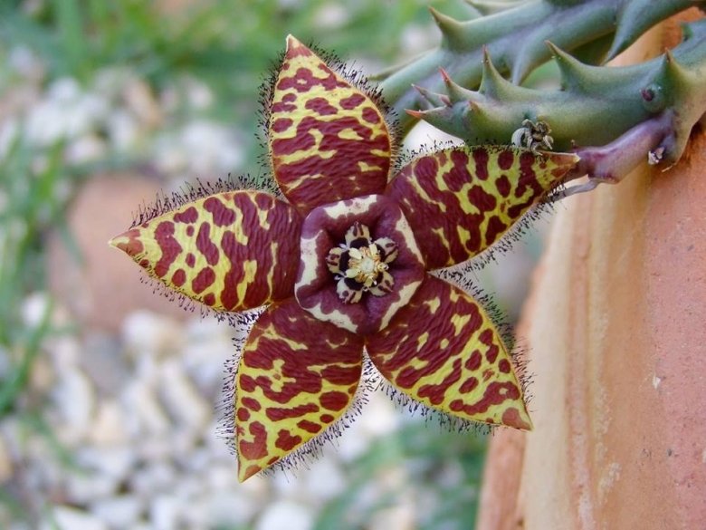 Description: Orbea semotaSN|30311]]SN|30311]] is a distinct stapeliad known for the foul smelling flowers that are designed by nature to attract flies for pollination. The fairly large flowers (to 50 mm across) vary from chocolate brown with a light pattern to pure yellow (var. lutea). The fine hairs flickering in the faintest breeze that cover the surface of the flowers, further enhance the resemblance to carrion, perhaps as an attraction to pollinators.