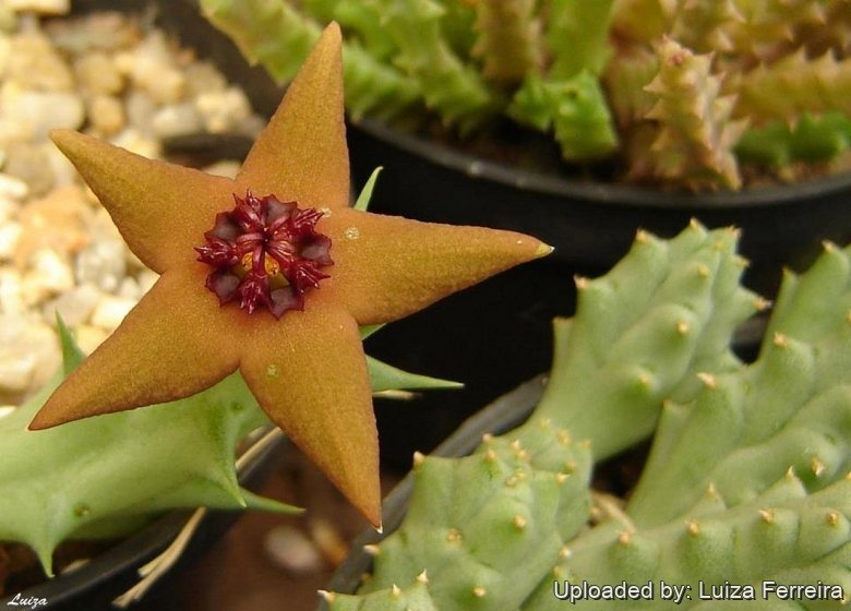 Angolluma araysiana (Orbea araysiana) Photo by: Luiza FerreiraCultivation and Propagation: Orbea araysianaSN|30637]]SN|30637]] is an easy blooming plant when mature that require moderately watering through the growing season but enjoy plenty of water and some fertiliser in hot weather, this helps them to flower freely. Water more sparingly in winter according to temperatures. But, as with most asclepiads, it is unwise to leave them wet in cold weather. Winter care presents no problems at 5°C with plenty of light. Since roots are quite shallow, use a cactus mix or add extra perlite or pumice to regular soil potting soil. A gritty, very free-draining compost is suitable, and clay pots help the plants to dry out between watering.