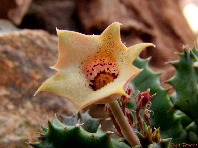 Flowers: 4–5 together at the lower part of the young stems. Flower stem less than 2 cm long. Sepals 5 x 1.5 mm. Corolla broadly bell-shaped, facing up, 20-35 nm in diameter (usually about 28-30 mm broad), creamy white, purple-mottled. Tube 7-10 mm cross, slightly pentagonal, papillous with red bands. Corolla-lobes triangular, flattened out widely, yellowish white and papillous, with 5 short tips. The intermediate tips are clearly developed. The papillae are flattened conical or hemispherical, sometimes covered with a 1 mm long bristle. The corona is cream to light brown, sometimes with brown spots, 3-4 mm in diameter and 4-5 mm high. The interstaminal lobes are notched or shortly toothed. The staminal corona lobes are approximately 1 mm wide with a blunt end. They meet on the stylus head. The surface is covered with very fine, blunted warts. The style head is conical and has a basal transverse furrow. The pollinia are brownish with a darker zone.