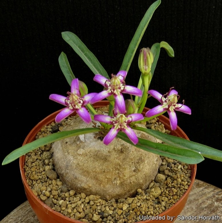 Description: Raphionacme splendensSN|31947]]SN|31940]] subs. bingeri is a caudiciform asclepiad with zig-zag shaped herbaceous annual stems up to 20 cm tall, growing from a sub-spherical tuber, up to 25 cm in diameter. This subspecies species is remarkable for its very few broader leaves ranging from ovate to elliptic, and conspicuously smaller purple flowers. It is an exceptionally beautiful species. Raphionacme splendensSN|31945]]SN|31940]] subs. bingeri is a geographical form of Raphionacme splendensSN|31940]]SN|31940]] distributed on the western part of the range, but not sufficiently differentiated from the standard R. splendens to be considered a good species in its own. R. splendens is one of the most widespread and morphologically variable taxon of the genus. Many of its geographical variant was early classified as different independent species, but nowadays all this plant are considered part of a multiform species, where each form is linked to others by populations of plants with intermediate characteristics. Venter (2009) regards Raphionacme bingeriSN|31940]]SN|31945]] morphologically as sufficiently unique to be given subspecies status.