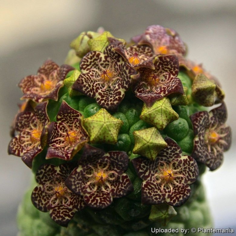 Flowers: 1–5 together, predominantly apical between the tubercles, subsessile or with pedicels up to 1 mm long, developing successively. Sepals 1.5-2 mm long, 1 mm broad, broadly ovate, acute, glabrous. Corolla hairless, campanulate, flat-topped and very shortly pointed in bud, when expanded about 8-16 mm in diameter, lobed to half-way down, without a distinct tube, the united part (central depression) 1-3 mm deep, flattish or saucer-shaped, margins not or only slightly thickened. Outside reddish spotted with green, glabrous and smooth, inside cream-coloured, irregularly speckled with red or dark maroon, occasionally uniformly dark purple, not ciliate. Lobes spreading, 2-5 mm long and 5 mm broad, nearly like an equilateral triangle in outline, acute, dark purple-brown tips curved outwards, margins more weakly curved. Corona cream-coloured, irregularly marked with pinkish or chestnut-brown, 3.5-4.5 mm in diameter, often with nectar droplets. Outer corona-lobes 2-5 x 3-5 mm divided into 10 filiform-subulate teeth 1-2 mm long, arranged in pairs behind the inner corona-lobes, very spreading to recurved at the tips towards each other, broadly ovate, acuminate. Inner corona-lobes 1-1.5 mm long, linear, obtuse, closely incumbent on the backs of the anthers and produced beyond them, with the tips connivent-erect.