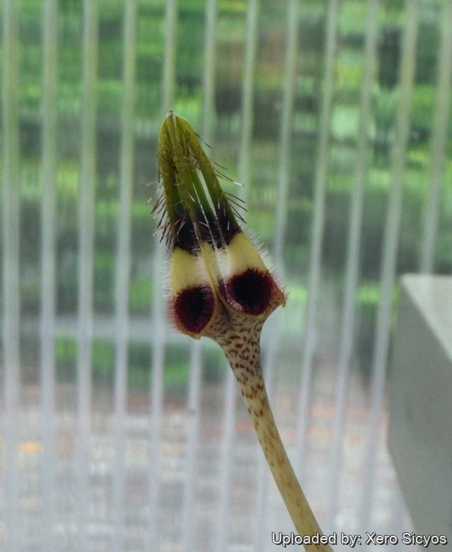 Flowers: 55-80 mm long. Sepals 4-6(-8) mm long, linear-lanceolate to linear-subulate, glabrous. Corolla-tube curved (often straight in dried specimens), 36-55mm long, cylindrically or with a weakly 5-angled basal inflation 12-18 mm long, 3-7 mm in diameter at the base, 2-3 mm in diameter above and dilated to 12-15 mm or more in diameter at the funnel-shaped mouth, outside glabrous, pale greenish below, whitish above, dotted or spotted with dark purple, inside softly hairy within inflation, glabrous elsewhere pale greenish white with purple dots and splotches, intensified towards mouth. Lobes linear, 18–28 mm long from a 8-10 mm-broad (when flattened out) triangular base, tips fused, folded back along the midrib so as to form pocket-like openings between them, keeled down the inner face, purple-brown crossed by a broad transverse white band at the base, above passing into bright green or first into blackish-green and then to bright green, thinly hairy on the inner face below and ciliate to nearly half-way up with fine soft spreading hairs, glabrous above, but ciliate with long vibratile clavate purple hairs. Corona united at base, forming 5 shallow pockets with slightly spreading outer margin and confluent with base of inner lobes.