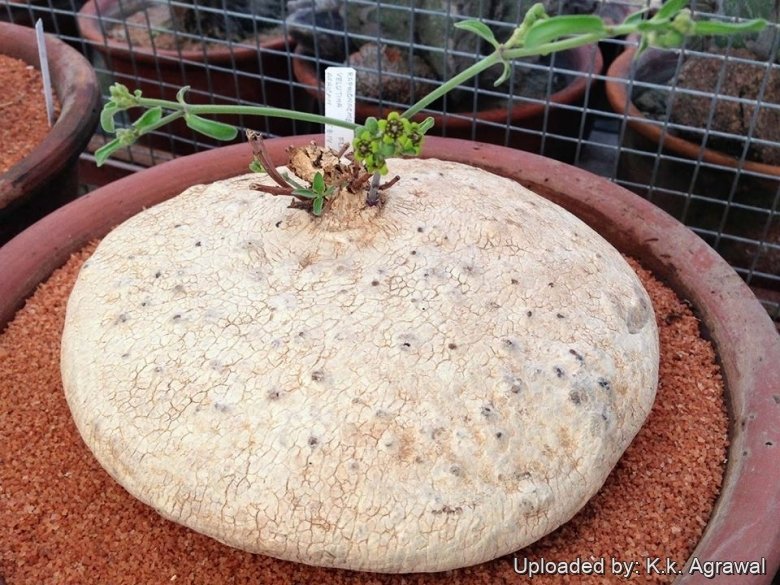 Caudex (Tuber): Big, mostly spherical-flattened or spindle-shaped, almost always unbranched, smooth, above-ground. It might grow to 30 centimetres or more in diameter.