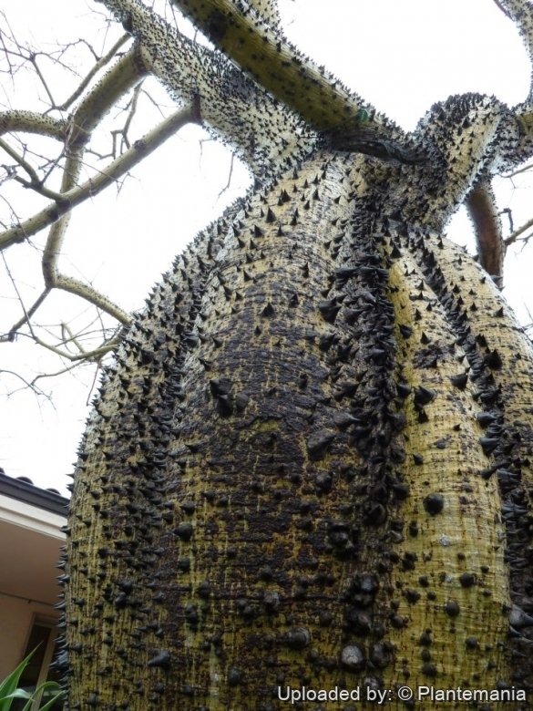 Stem: Trunk bottle shaped, straight, more or less convex or enlarged in the lower part with a diameter of 1-2 m which serve to store water at drought times. The wood is tender and porous. The bark is smooth with some stretch marks, green in the young specimen, green-grey or grey in the adult ones. Both the trunk and the branches are covered by conical thorns that can become over 2.5 cm wide as the tree grows and its trunk widens.
