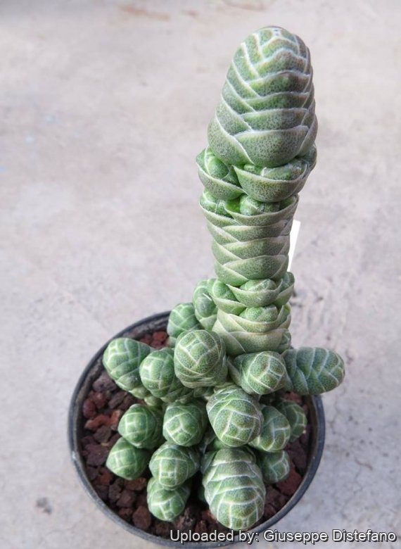 Bodies (stem and leaves together): The stem is covered neatly and smoothly by the overlapping leaves to form a short almost cylindrical column, which has something of the appearance of a tree cone. Younger branches are almost spherical and looks like grey-green rosebuds.