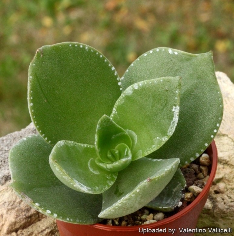 Leaves: Sessile, crossing each other in pairs, thick, fleshy, leathery, narrow-obovate, to oblanceo-late, narrowed and connate at the base round the stem, (25-)30-50(-70) long, (10-)15-25(-30) mm broad, flat and convex on both sides, glabrous, usually dull green, with a row of white dots both above and below just within the margin. Margin horny entire and often with yellowish.