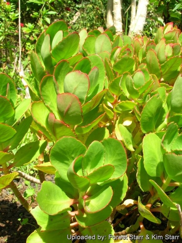 Description: Kalanchoe crenataSN|29112]]SN|29088]] is an ornamental herbaceous perennial succulent shrub forming one to several erect stems 0.3-2 m tall, it is commonly called Kalanchoe, Mother of millions, never die, Dog's liver and may be confused with Bryophyllum pinnatumSN|29120]]SN|29120]]. The inflorescences are produced during late autumn and winter, presenting rounded heads of long, tubular orange flowers. After flowering, all aerial parts die back to a persistent rootstock, having expended their energies in the production of copious dust-like seed.